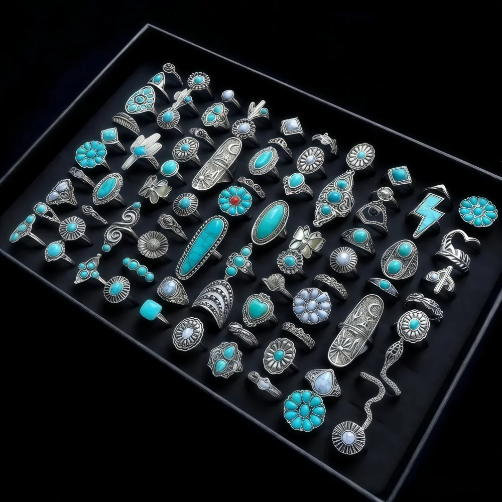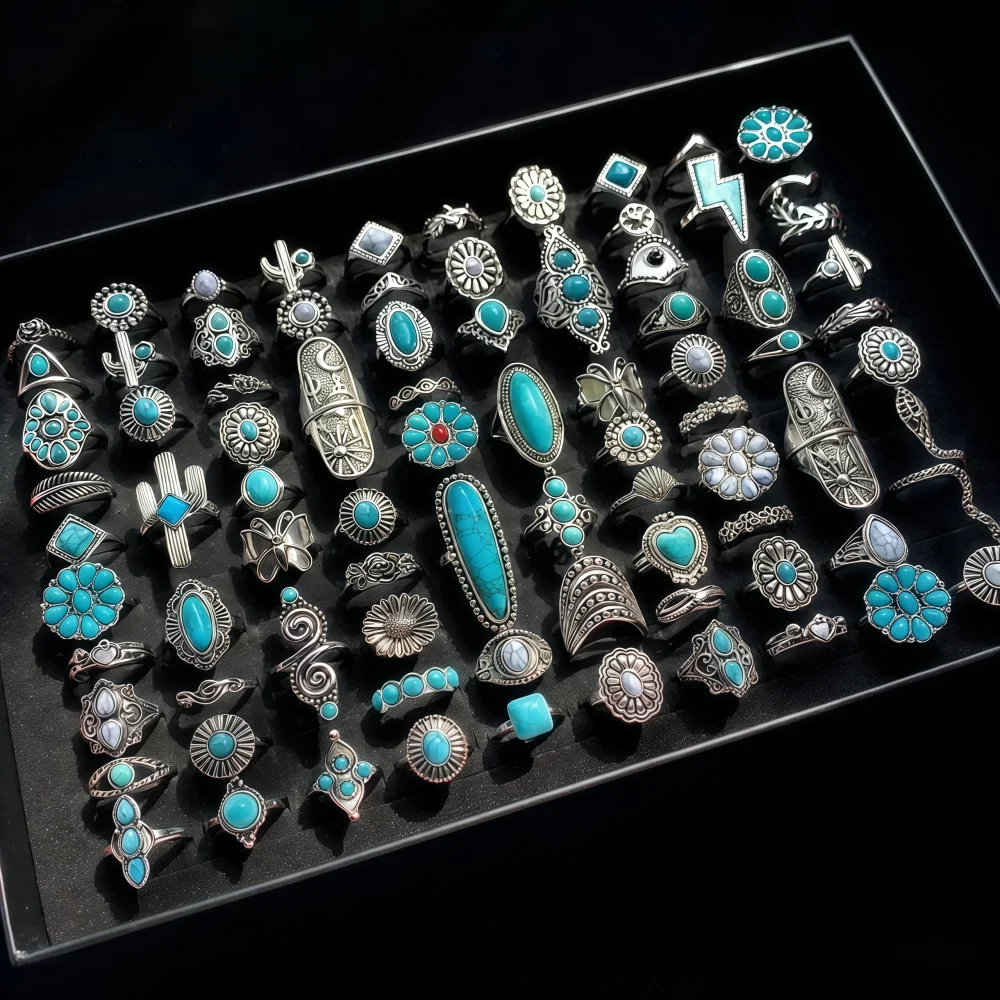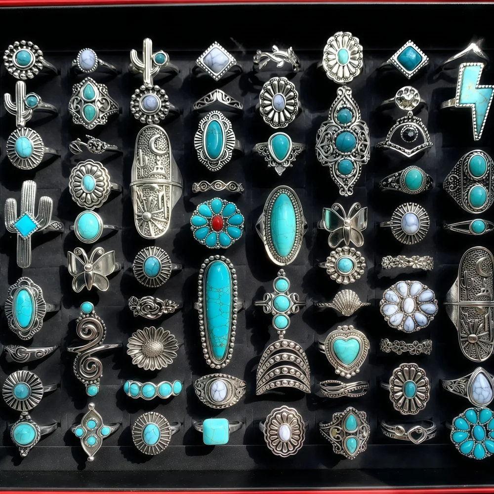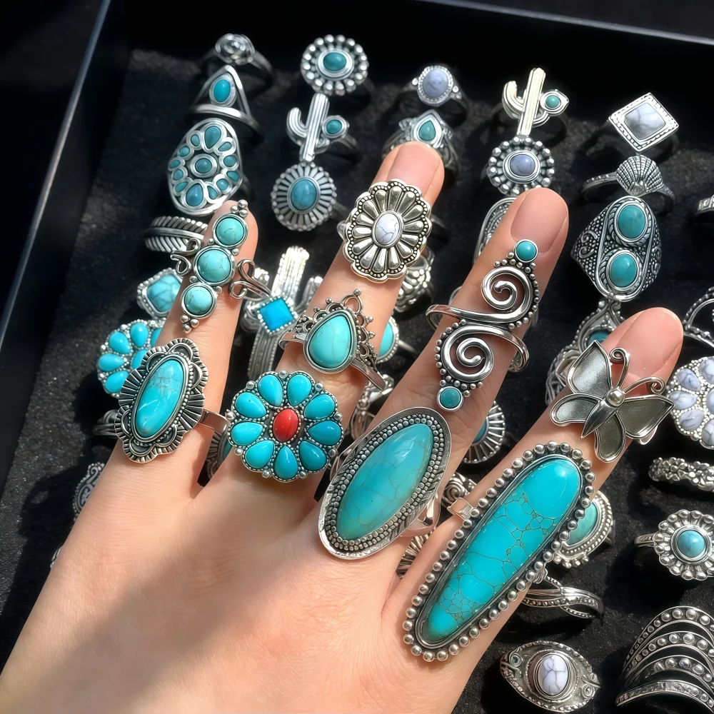 6/8/12/24Pieces Retro Bohemian Turquoise Rings Set For Women Mix Style Trendy Finger Party Daily Jewelry