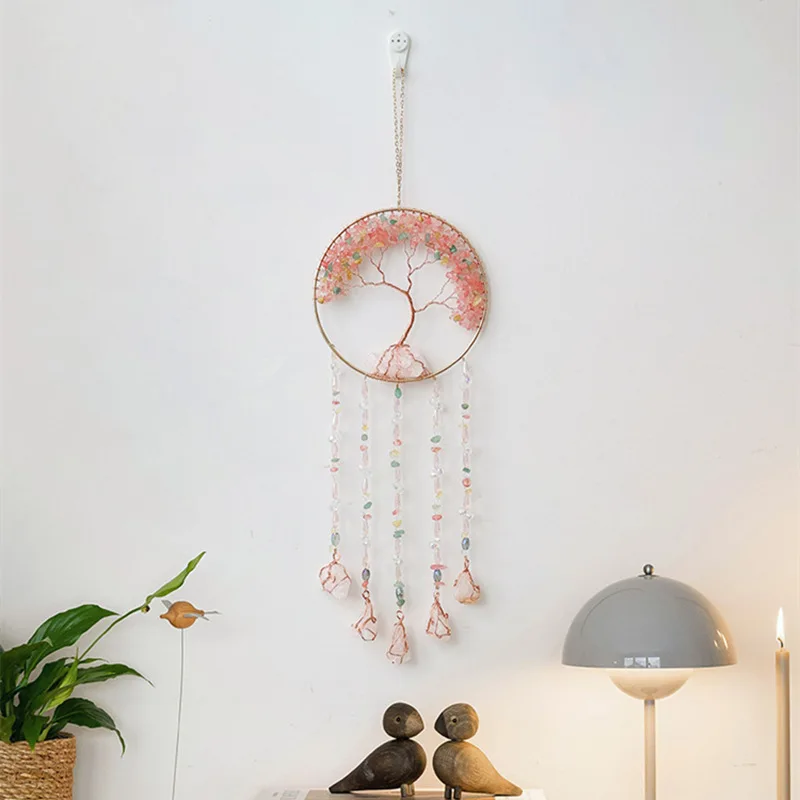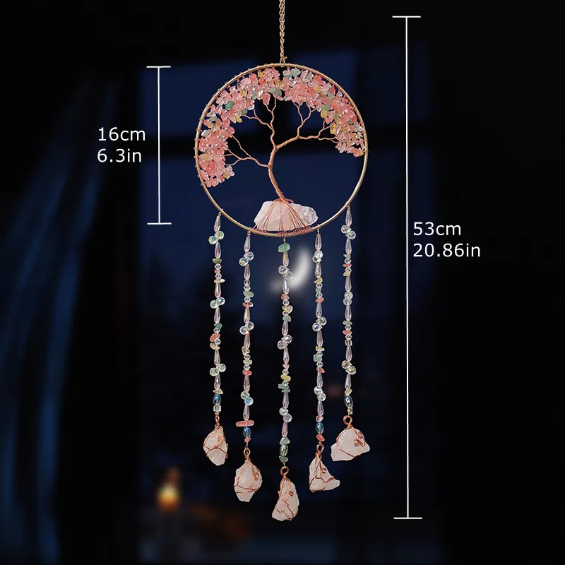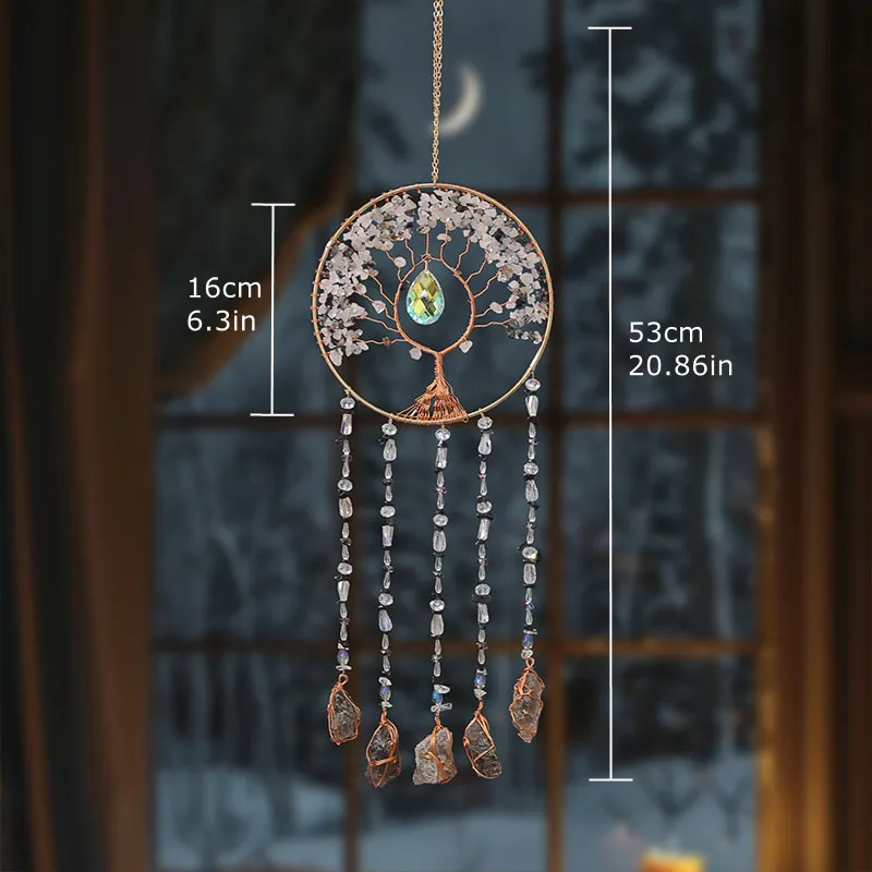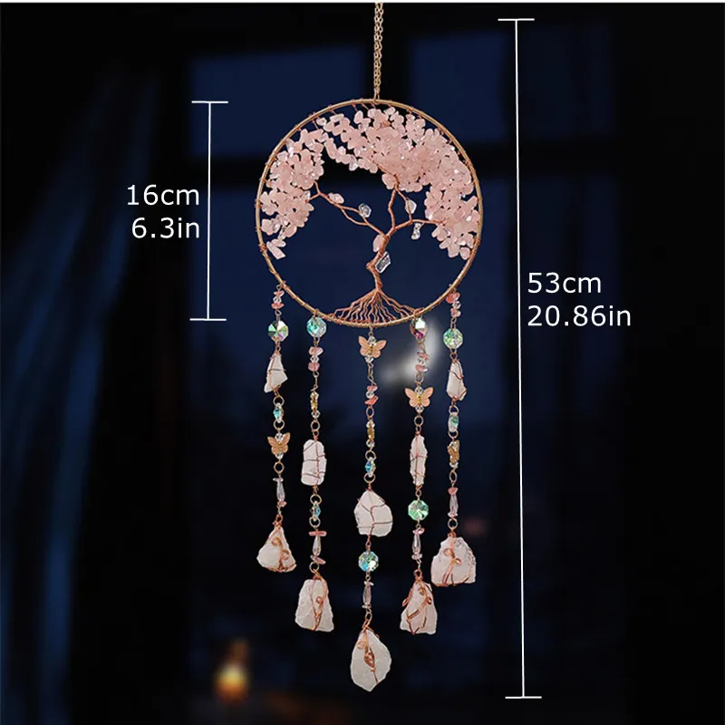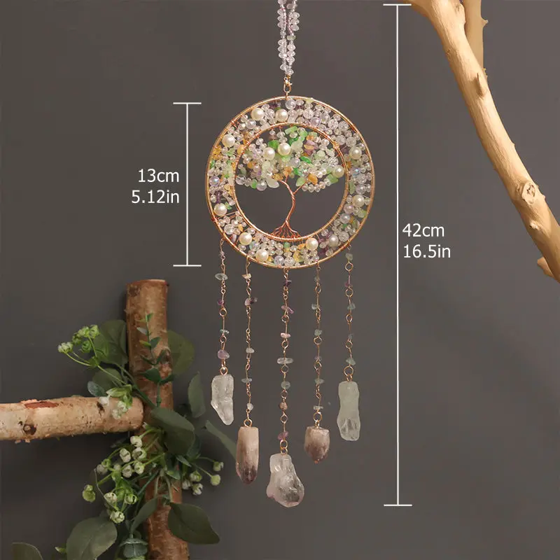 Crystal Suncatcher Hanging Home Decor Gemstone Pink Quartz Fluorite Agate Amethyst Tree of Life Dream Catcher for Christmas Gift